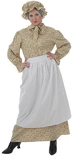 Brown Floral DressMatching BonnetWhite ApronAuntie Em is a surrogate mother to Dorothy and the reason she’s tries so desperately to return back to Kansas. In this Auntie Em costume you can be just like the character from the Wizard of Oz. The long dress is a 100% cotton and ties around the back of the neck. The tan costume has a floral background and ruffles around the wrist. A white apron lays over the dress and ties in the back and a matching bonnet with a tassel rim is also included.