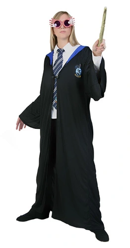 Adult Ravenclaw Robe**Glasses, wand, and tie sold separately.Get the look of the kooky but loveable Luna Lovegood this Halloween with our Luna Lovegood costume. This costume comes with an adult Ravenclaw robe that has a blue lining in the pointy hood. The robe also comes with a black clasp that you can position anywhere on the robe for the perfect fit. The polyester robe has a screen print Ravenclaw emblem on the front. Add a pair of Spectre Specs and a wand for the perfect Luna Lovegood costume this Halloween!