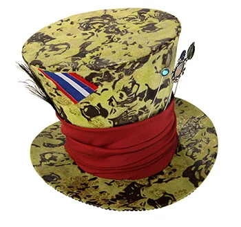 Hat w/Hat Pins and FeathersPut your Mad Hatter costume over the top with this top hat! This polyester hat is covered in a light green, suede-like material with green and brown leather-like accents. It measures 8 1/2″ tall and has a 23″ circumference (please note due to the item’s authenticity, each hat was handmade and the circumference may vary). A rose colored scarf wraps around the brim while a peacock feather, a red white and blue patch and four pins with jewels decorate the hat. A must-have accessory for all Alice in Wonderland fans!