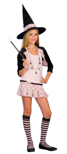 She might have gone to Charm School, but the only Charms she knows are magical ones! Schooled in the art of Black Charmed Magic, the Charm School Witch Teen Costume includes a black witch hat with pink plaid trim, a bolero jacket with matching pink plaid collar, a mini dress that features a light pink top, a black belt, and an attached pleated pink plaid skirt, a fun charm necklace and striped pink and black knee high socks.
