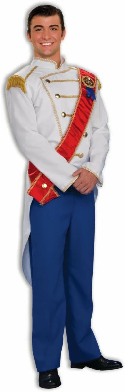 Charm all the ladies in the countryside in this stunning ensemble! Perfect for plays, parades, parties and so much more! Includes long white tail coat with golden trim and buttons, red military-inspired sash and blue pants. Now all you need is a white horse to ride up on!
