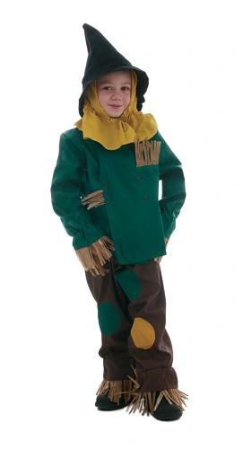 Scarecrow Shirt w/StrawPants w/StrawHatFollow the Yellow Brick Road to the land of Oz in this children’s Scarecrow costume. This three-piece costume includes a hat, shirt and pants. The black, pointy hat has a circumference of 18″. It has an attached gold hood that has a large hole for the face. Below the hole, an elastic band tightens the hood around the neck and the extra fabric lays over the shirt. The green shirt is made of polyester and cotton. It closes with two sets of snaps on the shoulders and a double row of snaps down the torso. An elastic wristband create a flare on the end of the long sleeves and fringe lines the sleeves and embellishes the chest. Fringe also trims the bottom of the pant legs which have an elastic band over the ankles. The brown pants have two large, green circles sewn on the front with a yellow circle on the side. The pants are secured with an elastic waistband. You’ll be ready for the journey when you add our Scarecrow Face Makeup!