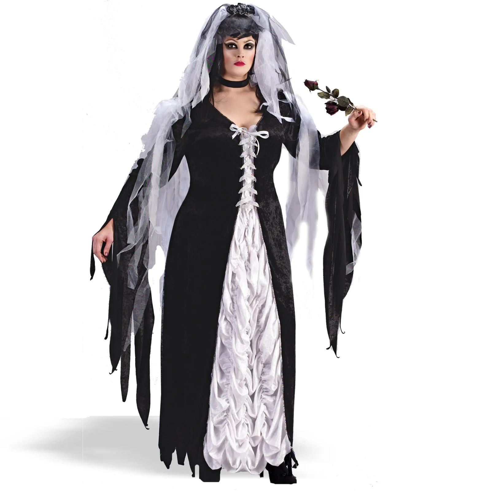 Includes a black and white velvet dress with coffin inset and tie bodice, white shoulder tatters, choker and matching veil.