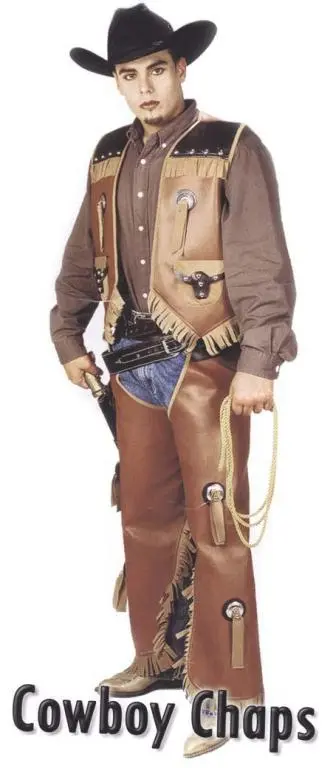 Perfect cowboy look. Faux leather chaps and vest with fringe.