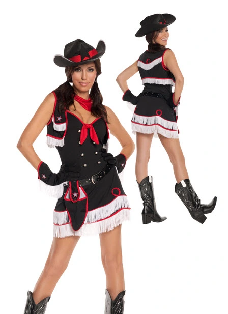 Costume includes: Dress, vest, gloves, belt, holster, neck piece and cowgirl hat.
