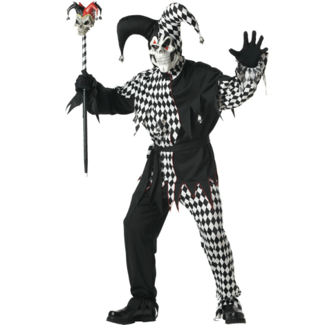 Here’s a joker who’s no fool! Make a royal statement with this Evil Jester costume! Costume includes: a double knot polyester shirt with skull trim, black & white checkered pants, black waist sash, black & white checkered headpiece, and a skull character mask.