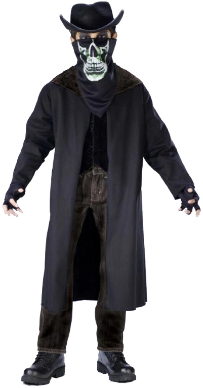 Costume Includes: Coat, vest, fingerless gloves, and skeleton scarf mask.
