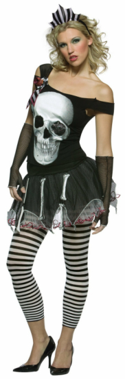 Become the perfect mix of sexy and scary in the FacesT – Skull ensemble which includes: An off the shoulder skull screen-print top featuring an attached rose with striped ribbon embellishment and a black mesh skirt featuring bone screen-prints and an organza underlay with fuchsia ribbon trim. Mesh fingerless gloves, striped tiara and black/white striped leggings are also included in this glam goth look.