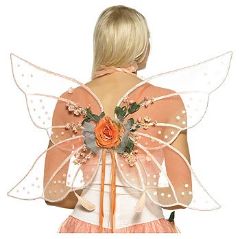 Fairy WingsAdd these elegant wings for a unique fairy costume. The mango-colored wings attach with elastic shoulder straps and features a large, orange rose in the middle. White netting and green leaves surround the rose and small, pink flowers with green leaves bud out from it. The wings fade to white towards the outside where white, glittered dots line the edges. The entire set of wings is trimmed in glitter. These wings are the perfect accessory for our Sexy Fairy Princess Costume!