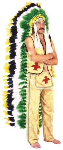 Realistic Native American HeaddressThis accessory is fit for a chief. Don’t leave out this detail for your next Native American costume. The Headdress is just like the warbonnet worn by the Plains Indians. The soft felt headpiece has a band of elaborate hand beaded design of multicolored seed beads along the forehead. Strips of white feathers frame the face and the tail has a row of eagle like feathers accented by green and yellow that extends to the floor. Get this war bonnet to symbolize your bravery this Halloween.
