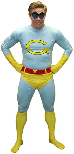 Eye MaskBeltGlovesShirtPantsSocksUnderwearThis hilarious superhero costume is straight from the Ambiguously Gay Duo cartoon sketch with Ace and Gary! The Gary costume consists of a light blue shirt and matching pants made from a nylon and spandex blend. The shirt features a yellow “G” screen printed on the front while the pants have an elastic waist for a snug fit. A pair of yellow underwear, also with an elastic waist, and an elastic red belt with yellow accents embellish the pants. Matching yellow socks and gloves are also included and a black and blue eye mask completes the costume. The mask is held in place with a thin elastic band. Add our coordinating Ace costume for a complete look!