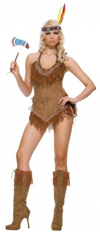 Costume includes: lace up sides, fringe detailed mini-dress, feathered headpiece, and tomahawk.Available sizes: