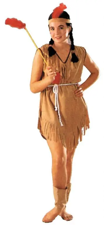 Costume Includes: One piece dress of imitation nylon suede with a tie cord belt. Includes matching headband with feather.