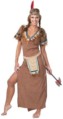 Full Length Dress w/ Double Side SlitsHeadband w/ FeatherYou’ll truly be a princess with this Indian princess costume. The Native American brown, full-length dress is made of 100% polyester and features double slits along the sides. There is a feather trim around the neckline and short sleeves while a matching apron is attached to the waist. In addition, a colorful, elastic headband with red feather is also included. You can have the best Native American costume around by wearing our Indian princess costume.