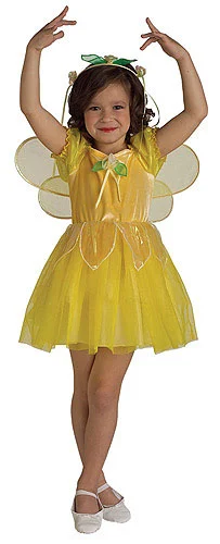 DressWingsHeadpieceThe Kid’s Buttercup Fairy Costume will make your child glow bright on Halloween night. The three-piece costume includes a yellow, polyester dress that slips on over the head. The top is soft and features shiny white and purple roses at the center. The short sleeves are made from netting fabric and are secured with elastic bands. The waistband has elastic and is lined with flower petals. The skirt is covered in two layers of yellow tulle and is thigh length. A halo with yellow roses and ribbons slips into the hair and a pair of wings made out of yellow netting can be attached with Velcro at the back. Complete your child’s costume with our fairy purse or any other fairy accessory for a great Halloween season.