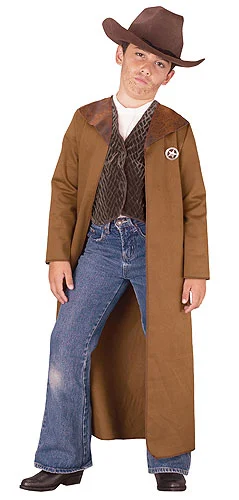 Full Length Jacket w/Sheriff StarVestHatBring to life a classic western in this kid’s cowboy costume. The boy’s costume includes a brown, full-length jacket that is 100% cotton. It is accented with a leather-looking collar and has a removable sheriff’s badge. A soft, grey vest is worn under the jacket and velcros in the front for closure. Top the costume off with the brown cowboy hat with strings. Add the double holster gun set and round up all the outlaws this Halloween season.