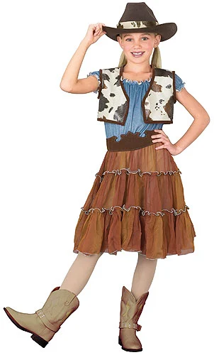 Dress w/Denim Top and Ruffle SkirtCow Print VestBeltCowgirl HatThis adorable kids cowgirl costume includes a woven and knit polyester dress with a blue, denim-patterned peasant top and brown tiered skirt with a smooth, comfortable lining. The coordinating vest is made of 100% knit polyester, but has the look and feel of colorful spotted cowhide. Also included is a unique, soft brown belt and a matching felt cowboy hat with a hatband made of the same material as the vest to tie the whole outfit together perfectly. Add a pair of girls’ cowboy boots, and your child is sure to have a costume that is ready for the open range!