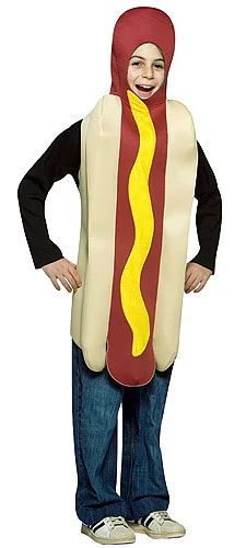 Poly Foam Hot Dog CostumeOur kids hot dog costume is a hilarious choice for Halloween! The funny costume consists of a poly foam hot dog suit that features a bun, hot dog and a squirt of mustard made from flannel. The suit has a slit for the face as well as a holes for the arms and open on the bottom for easy movement. You’ll be ready for a ball game in this fun Halloween costume!