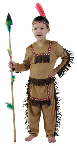 Long Sleeve Shirt w/Fringe and Ribbon TrimMatching Pants w/Loin ClothHeadband w/FeatherThis kid’s Indian boy costume is perfect for the littlest member of your tribe! The costume includes a matching long-sleeved shirt and pants that are made from polyester. They have the appearance of suede and are lined with dark brown fringe. In addition, the pants have an elastic waistband and an attached loin cloth. The cloth, shirt and included feather headband have a red and white ribbon that accent the costume. The ribbon features an authentic and traditional Native American pattern. Your child will be set to learn about the Native American culture when you add any of our coordinating accessories!