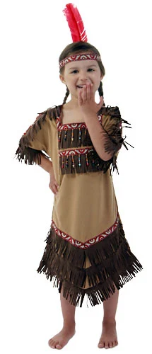 Short Sleeve Dress w/Ribbon, Bead, and Fringe TrimMatching Headband w/FeatherYour child will love dancing around the camp fire in this kid’s Indian girl costume! The authentic costume features a brown, suede-like dress that has long sleeves and is made from polyester. It is lined with dark brown fringe along the sleeves, chest and bottom. The chest also features strings of colorful beads while a traditional red and white Native American pattern accents the entire costume. The same pattern is found on the included feather headband. Perfect for trick-or-treating!