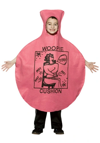 Child whoopie cushion tunicYour favorite gag comes to life this Halloween! The comical kids Whoopie Cushion costume is a one-piece outfit made from 100% polyester material. The top is open above the head and there is a large cut out for the face and arms, and an opening for both legs. The classic pink whoopie cushion has a printed design on the front. A super funny Halloween costume for any child! Fart noises not included.