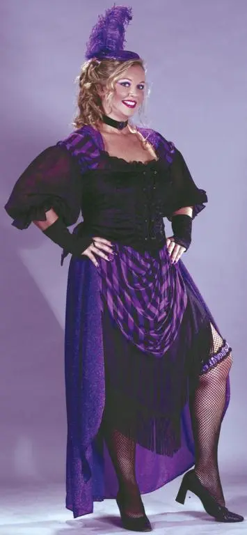 She knows when to hold ’em!Costume includes: Dress with gathered skirt, sheer sleeves, and attached bustle back bow. Also includes lace-up corset, leg garter, choker, glovelets, and hat with feather plume.Available size: