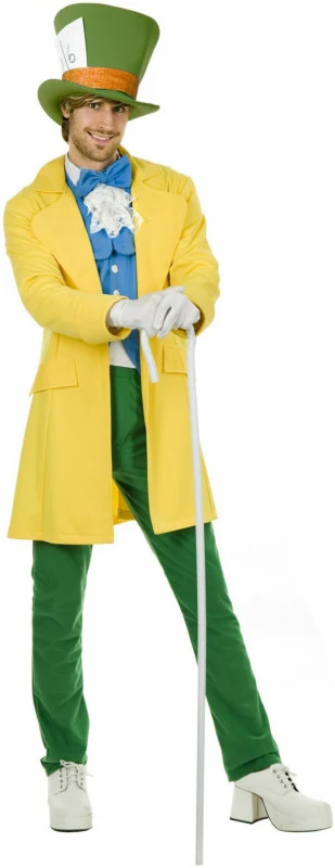 This marvelously mad look is where it’s at! Get a little crazy in the Mad Hatter costume which includes a charming yellow jacket, blue vest, matching tie and a lace gentleman’s jabot. Velvety green pants are also included in this eccentric ensemble.