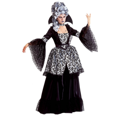 The Savoir FaireT Madame de Sade costume includes a satin and lace full-length dress with flocked brocade details. The padding under the brocade overskirt gives a full appearance to the hip which was popular during this time period. The bell sleeves, along with the flocked brocade neckband with stand-up collar, lend to the dramatic element of this costume. You are going to take center-stage with this elaborate costume!