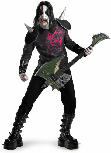 Enter the world of zombie rock with the Metal Mayhem Costume which includes: A shirt with paint splatter screen print removable shoulder armor with attached plush spikes, faux leather gauntlets and half mask with gash detail and attached hair.