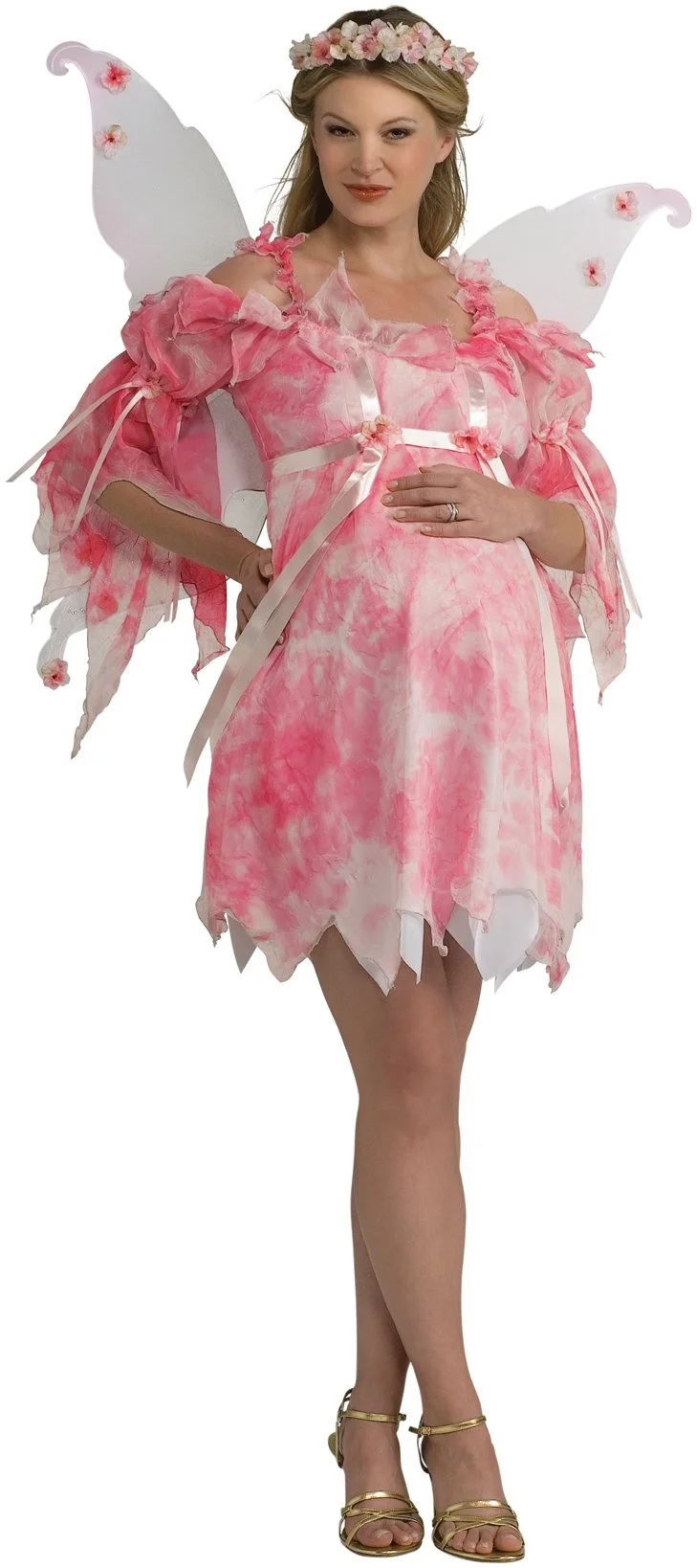 A pretty and enchanting costume that will enhance your maternity glow. This three-piece costume set features pink tye-dye peasant-style dress with pink lace-up at the bodice and torn trim at the sleeves and skirt, a pink flower headpiece and white fairy wings with pink flowers at the tips. A disguise that is specially designed for pregnant women.