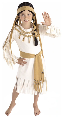 DressHeadbandWaist SashCreate fun Indian fashion with this Native American child costume. The cream colored Indian dress is made of 100% suede-like polyester and a decorative fabric and turquoise beaded neck line. Fringe drapes along the sleeves and hem of the dress and a Velcro strap closes behind the neck. The costume comes with a matching Indian headband and sash. You will have an impressive Native American Halloween costume when you arrive in this girls costume! Add an Indian bow and arrow as a fun accessory!