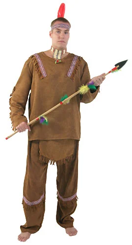 Long Sleeve Shirt w/Fringe and Ribbon TrimMatching Pants w/attached Loin ClothHeadband w/FeatherYou’ll have all the ladies in the tribe going crazy in this deluxe Indian costume for men! The fun and historical costume is made from brown polyester but has the appearance and feel of suede. The shirt has long sleeves while the pants have an attached loin cloth and are secured in place with an elastic waistband. Both the pants and shirt are lined with fringe and trimmed in ribbon with a traditional red, white and black Native American pattern. That same pattern is featured on the included headband that also has an attached feather. Top this costume off with any of our male Indian wigs or toy weapons!