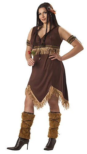 Dress w/Fringe TrimArmbandsFeather Hair OrnamentFur Boot CoversThis plus size Indian princess costume is a beautiful and sexy choice for Halloween. It consists of a soft, brown dress made from polyester with a traditional Native American pattern across the bust. The pattern features yellow, orange, green and brown with light brown fringe lining the pattern underneath. The same trim lines the jagged bottom hemline and beads are strung among the fringe. The dress has a v-shaped neckline with black string lacing up the lowest part allowing you to choose how much to reveal. A matching hair ornament clips into your hair and is embellished with orange and white feathers. Brown armbands are tied into place with black string and decorated with the same traditional Native American pattern. The costume is complete with faux, fur boot covers, which are also accented with black string. Find your warrior when you add any of our Native American wigs!