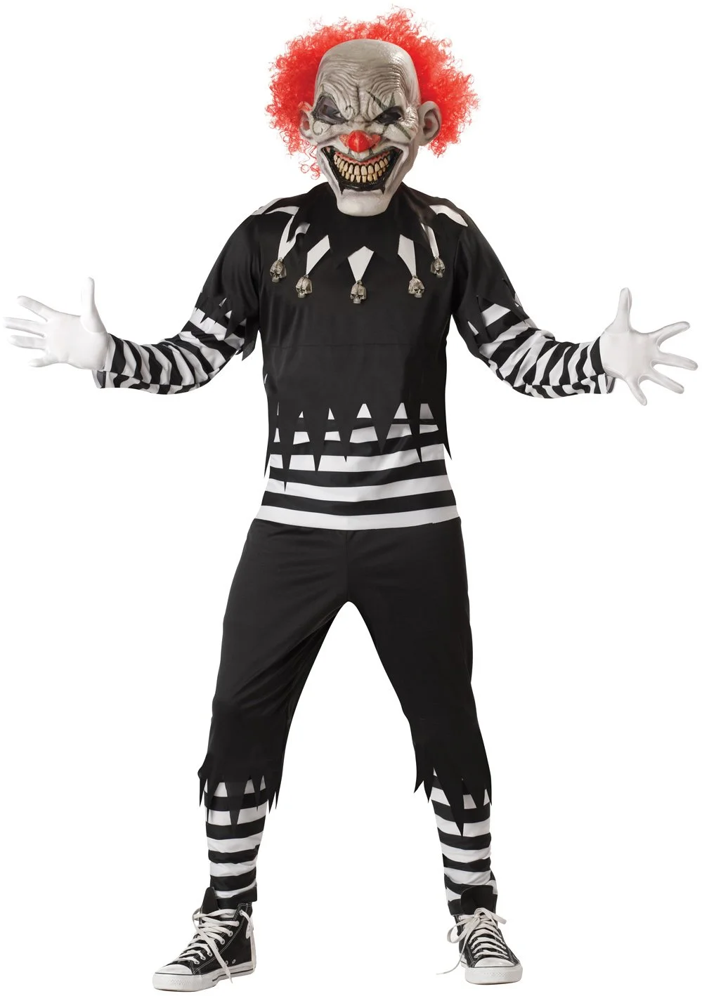 Things will definitely get a little crazy when you don this creepy clown’s costume which includes: A top featuring an jagged overlay with attached skulls, matching pants, and a clown mask with a diabolical smile and attached bright red hair.