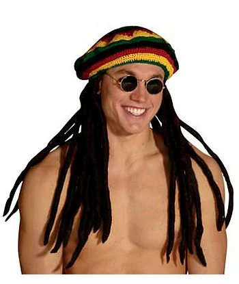 Knitted Rasta Hat w/attached DreadlocksGet a classic Jamaican look this Halloween with our Rasta hat! This 100% cotton, knitted Rasta tam has thick brown dreadlocks with scraggly ends attached to the back side of it. The hat has a traditional pattern in red, green, yellow and black and has a circumference of about 24 inches. With this funky Rasta tam, you’ll have the best costume at the whole party, mon!