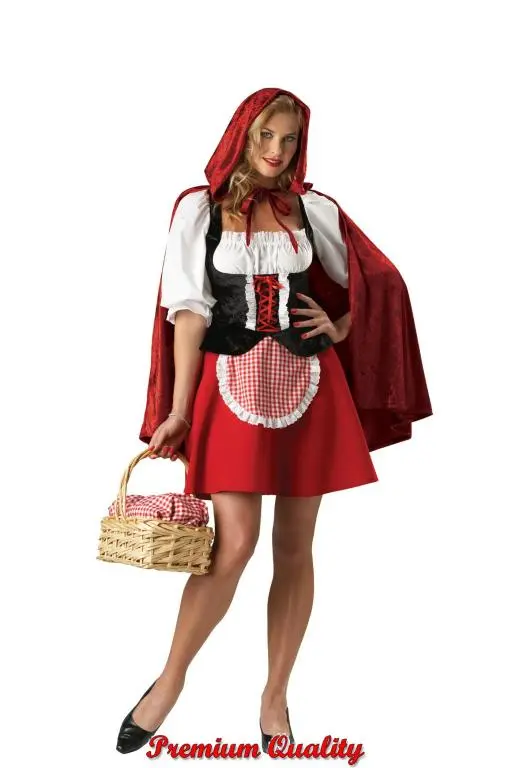 You will make a grand entrance in this super deluxe Theatrical Quality costume utilizing superior materials and trimmings along with true garment finishing. This style is available in multiple sizes for true apparel fit. The quality will be seen, felt and admired! This costume includes apeasant dress with attached apron plus hooded cape.