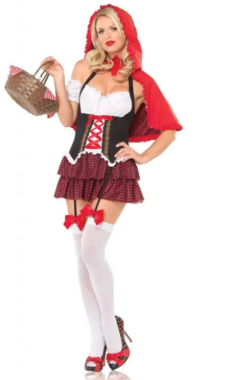 Costume includes: Garter dress with corset waist and gingham skirt, puffed sleeves and hooded cape.