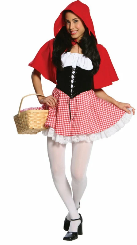 This Red Riding Hood is too pretty to be eaten by the Big Bad Wolf. Included in this costume is a faux corseted dress with lacing detail and bra top with elastic for adaptability, full back zipper and expandable panel to improve fit, hooded capelet with contrasting satin ribbon tie detail, and attached double tiered lace petticoat.