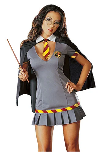 Knit DressCape w/attached Collar and TieGlassesWandYou’ll teach Harry Potter a thing or two about wizardry in this sexy costume! The women’s wizard costume includes a grey, polyester dress that zips and hooks in the back for closure. It has a plunging neckline and short sleeves lined in maroon and yellow trim. The same striped trim also sets off the mini pleated skirt. A “Wizard School” patch is printed on the chest to mimic the Hogwarts crest. The black cape has a white collar and an attached maroon and gold tie. It velcros in the front to secure the cape in place. You’ll be ready for the day’s lesson when you add our brown, toy wand and black, wire-frame glasses (please note the glasses do not have lens). Cast a spell on everyone you meet in this sexy wizard costume!