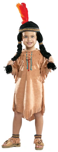 DressHeadband w/Attached Yarn Hair and FeatherAnkle FringesThis size small Indian girl costume is great for plays and Halloween alike! The dress secures with Velcro in the back at the neck and is made of soft polyester fabric. The bottom hemline is decorated with fringe matching the collar with three red and blue cords at the center. The wig has yarn hair and two long braids down the sides. There is a band of colorful pattern trim around the top of the head and on the braids with two attached feathers behind the head. The ankle fringes secure with Velcro and have matching trim and soft fringe.