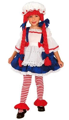 Dress w/ Attached ApronBonnet w/attached Yarn HairShe’ll feel like a real doll in our toddler Rag Doll costume for Halloween or dress-up play. The girls costume includes a long-sleeved red, white, and blue polyester dress, with a matching white bonnet, red yarn braids, and decorative blue bows. The dress has a sheer, white top with cuffed bell-sleeves and decorative red trim along the sleeves and neckline. White lace adorns the neckline while two blue straps run down the front. The attached white apron has delicate lace trim with two red bows attached where the blue straps meet the apron and apron strings to tie in back. An attached white petticoat with lace trim peeks out from under the skirt. The dress slips on over the head, with elastic in the waist for a comfortable fit. Top off the dress with the plush white bonnet with red rick-rack trim and attached red yarn hair. Add a pair of our black patent kids shoes for a classic storybook Halloween costume.