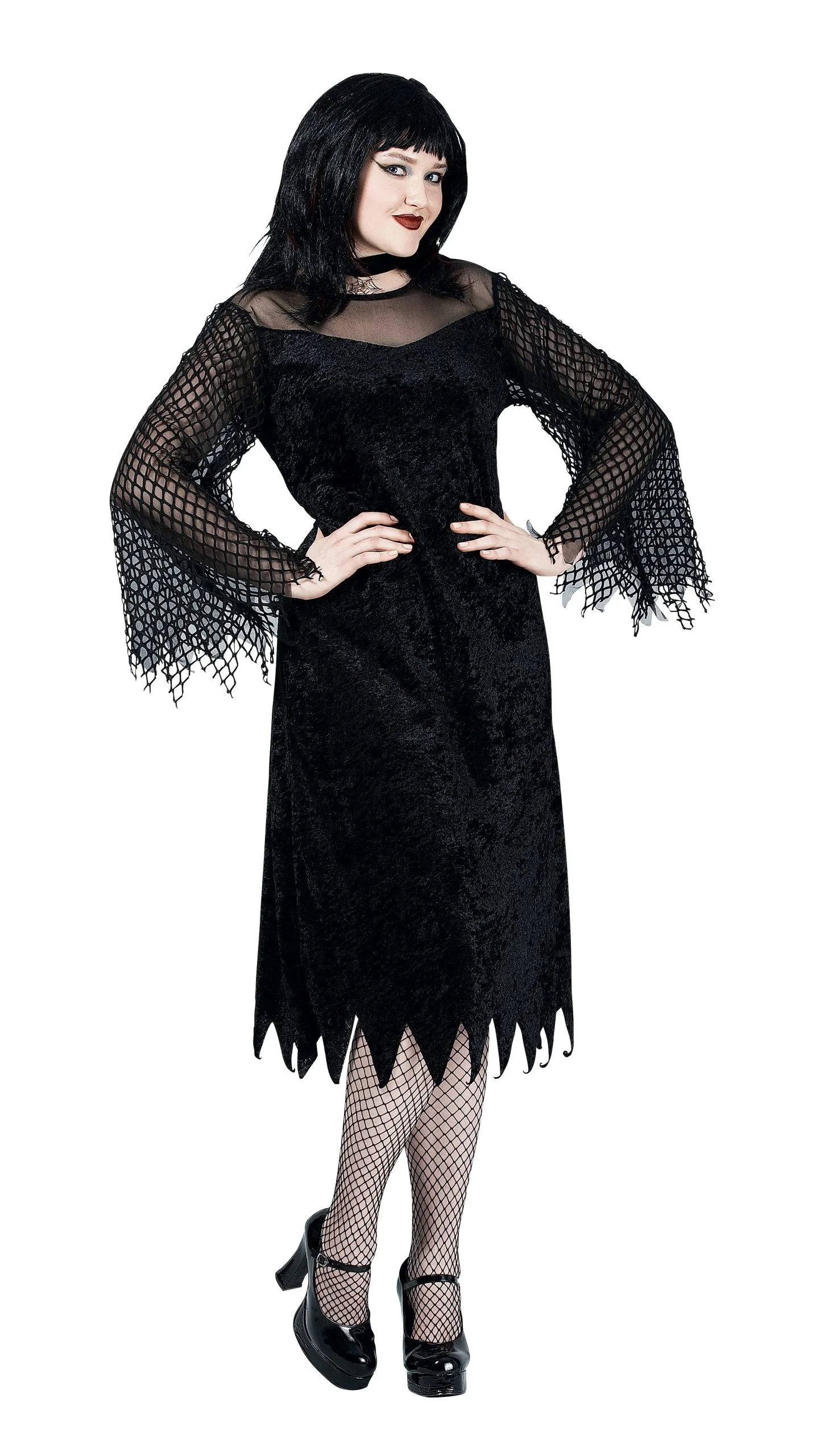 Aside from your killer eyes, you’ll need this phantasmagoric black velvety robe with its long, drapey fishnet sleeves and black mesh neckline. A black velvet choker with a pendant attached is also included to complete your ensemble. So don’t be shy. Go on and leave destruction in your wake. It’s what you do!