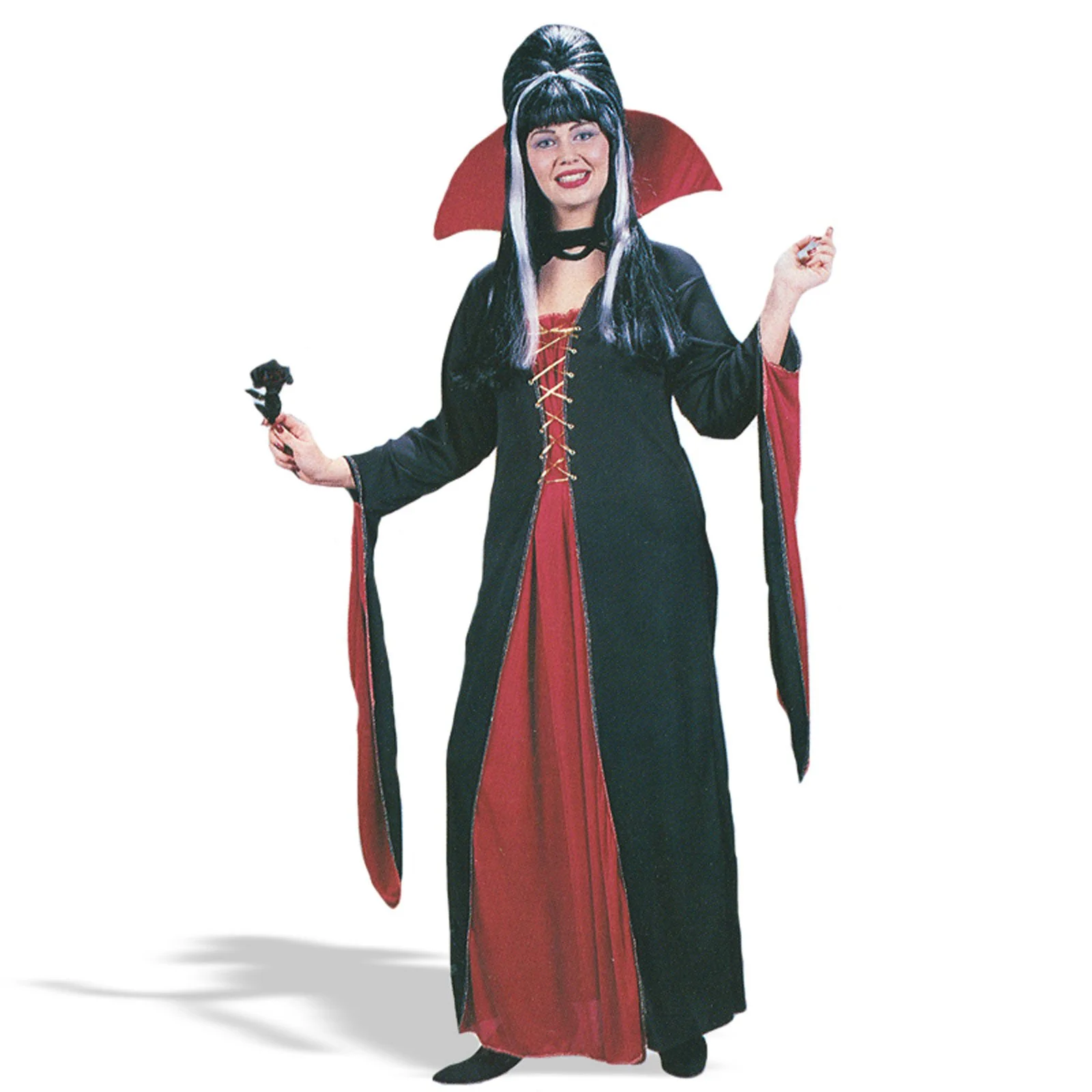 This is one damsel who causes the distress! This beautiful costume features a floor length, lace-up gown in black and red with gold trim, draped sleeves, and stand up collar with attached choker.