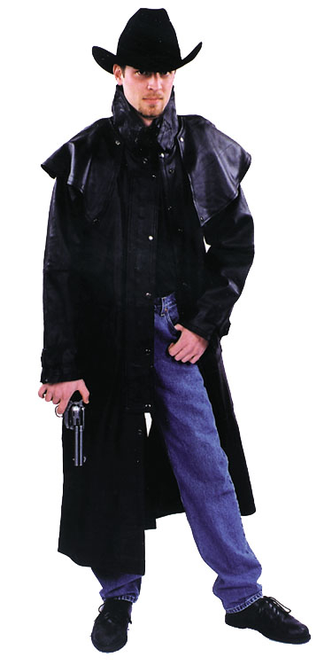 Tall Dark And Handsome CowboyCostume includes: This attractive long-length duster is made of soft genuine leather. Has a capelet-style collar and button down front. Black in color with superb styling.Available size: