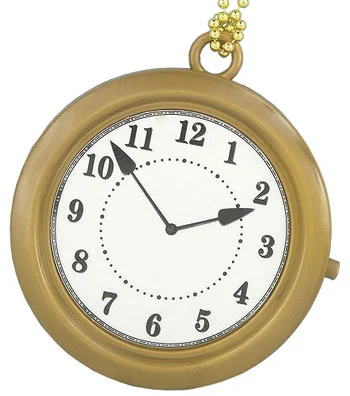 White Rabbit Clock AccessoryDon’t be late for your important date! This bronze-colored plastic clock with a white face and black roman numerals will make sure you get their on time. The clock measures 8″ across and the attached plastic chain is 17″ inches long.