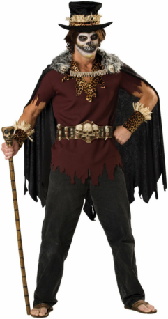 More a fan of alternative medicine, this Witch Doctor might heal you, or kill you! His sorcerer costume includes a maroon tunic with tattered sleeves and hem and a leopard collar, Fur trimmed cape with bone and tooth cape chain, black top hat with leopard and raffia detail, arm cuffs with raffia details, and a skull and tooth vinyl belt.